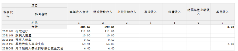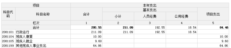 4.社會(huì)保障和就業(yè)支出(類)殘疾人事業(yè)(款)其他殘疾人事業(yè)支出(項(xiàng))年初預(yù)算為296.78萬(wàn)元,支出決算為285.81萬(wàn)元,完成年初預(yù)算的96.3%。決算數(shù)小于預(yù)算數(shù)的主要原因:控制壓減活動(dòng)項(xiàng)目經(jīng)費(fèi)支出。