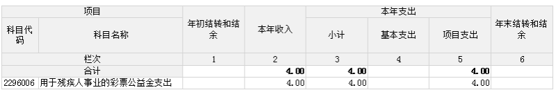 其他支出(類)、彩票公益金安排的支出(款)、用于殘疾人事業(yè)的彩票公益金支出(項(xiàng))。政府性基金財(cái)政撥款支出為22.8萬(wàn)元,主要用于兒童康復(fù)訓(xùn)練、早期干預(yù)相關(guān)支出。完成年初預(yù)算的100%。