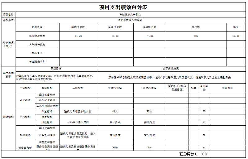 2.24年康復(fù)工作經(jīng)費(fèi)項(xiàng)目績(jī)效自評(píng)情況:根據(jù)年初設(shè)定的績(jī)效目標(biāo),項(xiàng)目績(jī)效自評(píng)得分為100分。項(xiàng)目全年預(yù)算數(shù)為20萬(wàn)元,執(zhí)行數(shù)為20萬(wàn)元,完成預(yù)算的100%。項(xiàng)目績(jī)效目標(biāo)完成情況:一是產(chǎn)出指標(biāo):為有需求的殘疾兒童提供基本康復(fù)服務(wù)15人次;二是效益指標(biāo):殘疾兒童通過康復(fù)救助,融入社會(huì)能力有所提高。