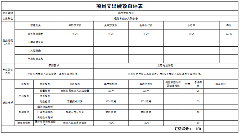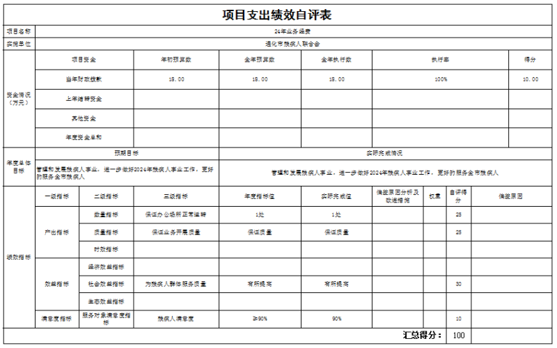 4.24年業(yè)務(wù)經(jīng)費(fèi)項(xiàng)目績(jī)效自評(píng)情況:根據(jù)年初設(shè)定的績(jī)效目標(biāo),項(xiàng)目績(jī)效自評(píng)得分為100分。項(xiàng)目全年預(yù)算數(shù)為18萬(wàn)元,執(zhí)行數(shù)為18萬(wàn)元,完成預(yù)算的100%。項(xiàng)目績(jī)效目標(biāo)完成情況:一是產(chǎn)出指標(biāo):保證辦公場(chǎng)所正常運(yùn)轉(zhuǎn),保證業(yè)務(wù)開展質(zhì)量;二是效益指標(biāo):為殘疾人群體服務(wù)質(zhì)量有所提高。