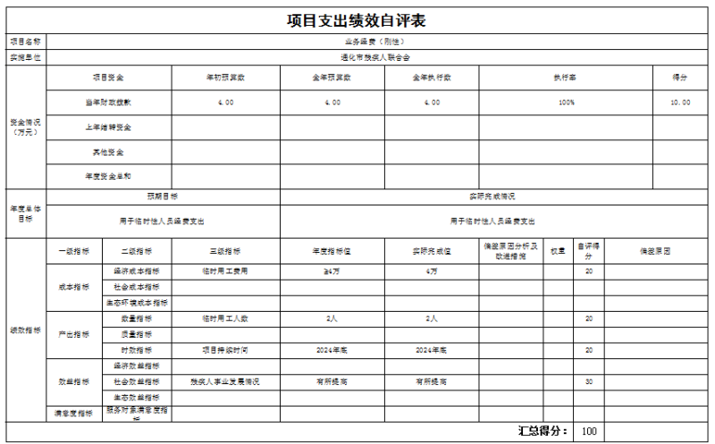 9.業(yè)務(wù)經(jīng)費(fèi)(剛性)項(xiàng)目績(jī)效自評(píng)情況:根據(jù)年初設(shè)定的績(jī)效目標(biāo),項(xiàng)目績(jī)效自評(píng)得分為100分。項(xiàng)目全年預(yù)算數(shù)為4萬(wàn)元,執(zhí)行數(shù)為4萬(wàn)元,完成預(yù)算的100%。項(xiàng)目績(jī)效目標(biāo)完成情況:一是成本指標(biāo):臨時(shí)用工費(fèi)用4萬(wàn);二是產(chǎn)出指標(biāo):臨時(shí)用工人數(shù)2人;三是效益指標(biāo):殘疾人事業(yè)發(fā)展情況有所提高。