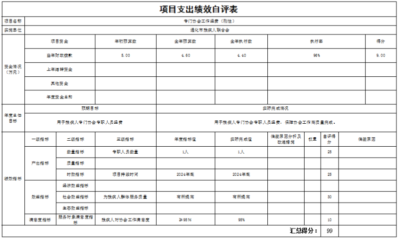 10.專門協(xié)會(huì)工作經(jīng)費(fèi)(剛性)項(xiàng)目績(jī)效自評(píng)情況:根據(jù)年初設(shè)定的績(jī)效目標(biāo),項(xiàng)目績(jī)效自評(píng)得分為96分。項(xiàng)目全年預(yù)算數(shù)為4.6萬(wàn)元,執(zhí)行數(shù)為4.4萬(wàn)元,完成預(yù)算的96%。項(xiàng)目績(jī)效目標(biāo)完成情況:一是產(chǎn)出指標(biāo):專職人員1人;二是效益指標(biāo):為殘疾人群體服務(wù)質(zhì)量有所提高。