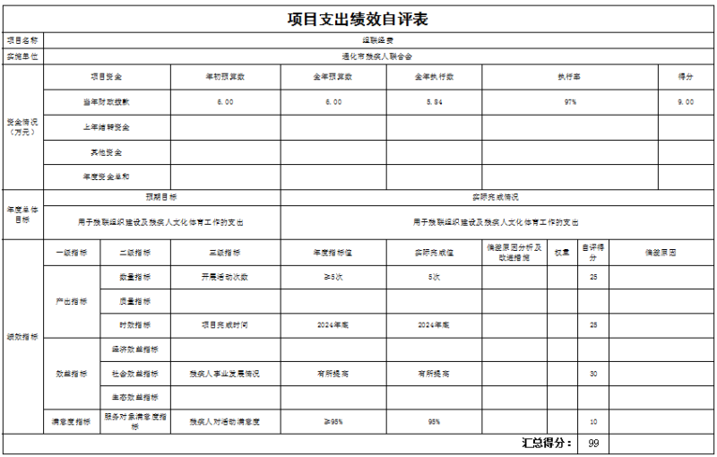 8.組聯(lián)經(jīng)費(fèi)項(xiàng)目績(jī)效自評(píng)情況:根據(jù)年初設(shè)定的績(jī)效目標(biāo),項(xiàng)目績(jī)效自評(píng)得分為99分。項(xiàng)目全年預(yù)算數(shù)為6萬(wàn)元,執(zhí)行數(shù)為5.84萬(wàn)元,完成預(yù)算的97%。項(xiàng)目績(jī)效目標(biāo)完成情況:一是產(chǎn)出指標(biāo):開展殘疾人活動(dòng)5次;二是效益指標(biāo):殘疾人事業(yè)發(fā)展情況有所提高。