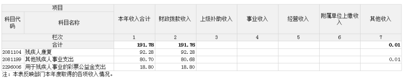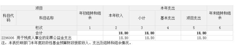 其他支出-彩票公益金安排的支出-用于殘疾人事業(yè)的彩票公益金支出18.8萬元,主要用于兒童康復(fù)訓(xùn)練費支出。