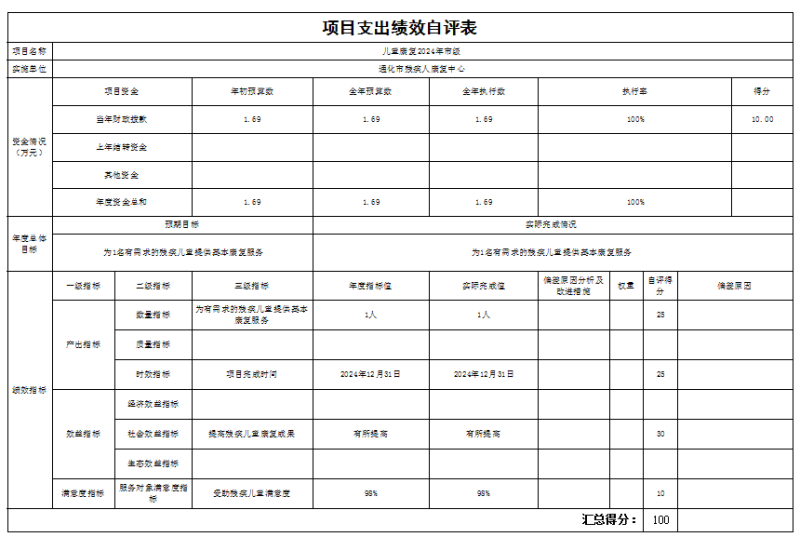 2.兒童康復(fù)2024年市級項目績效自評情況:根據(jù)年初設(shè)定的績效目標,項目績效自評得分為100分。項目全年預(yù)算數(shù)為1.69萬元,執(zhí)行數(shù)為1.69萬元,完成預(yù)算的100%。項目績效目標完成情況:一是產(chǎn)出指標:為1名殘疾兒童提供基本康復(fù)服務(wù);二是效益指標:殘疾兒童康復(fù)成果有所提高。