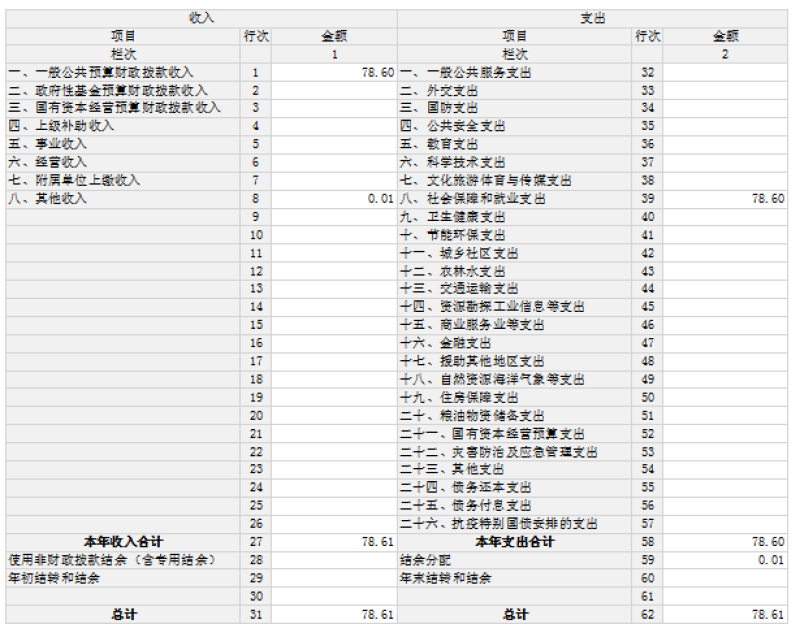 2024年度收、支總計(jì)均為78.61萬(wàn)元。與2023年度相比,收、支總計(jì)各增加19.39萬(wàn)元,增加32.7%。主要原因:增加人員基本支出。