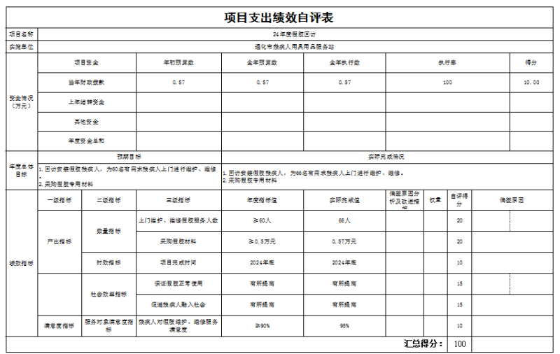 24年度假肢回訪項(xiàng)目績(jī)效自評(píng)情況:根據(jù)年初設(shè)定的績(jī)效目標(biāo),項(xiàng)目績(jī)效自評(píng)得分為100分。項(xiàng)目全年預(yù)算數(shù)為0.57萬(wàn)元,執(zhí)行數(shù)為0.57萬(wàn)元,完成預(yù)算的100%。項(xiàng)目績(jī)效目標(biāo)完成情況:一是產(chǎn)出指標(biāo):上門(mén)維護(hù)、維修假肢服務(wù)66人;二是效益指標(biāo):保證假肢正常使用、促進(jìn)殘疾人融入社會(huì)都有所提高。