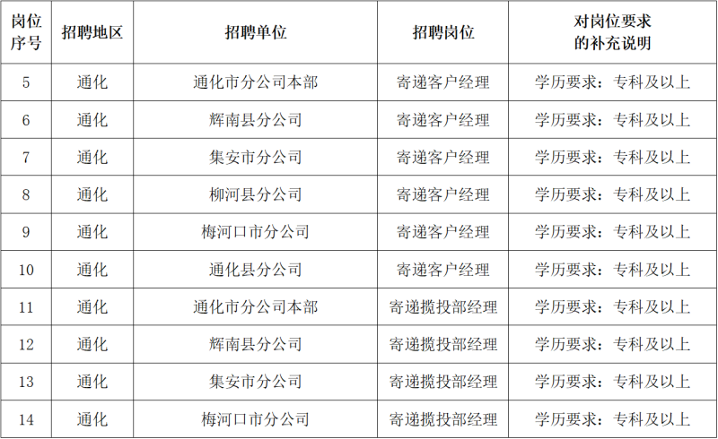 為進(jìn)一步充實(shí)中國(guó)郵政集團(tuán)有限公司通化市分公司寄遞(快遞)專業(yè)工作力量,加強(qiáng)寄遞(快遞)業(yè)務(wù)生產(chǎn)隊(duì)伍建設(shè),現(xiàn)面向社會(huì)公開招聘寄遞(快遞)攬投部經(jīng)理、寄遞(快遞)客戶經(jīng)理。招聘有關(guān)事項(xiàng)公告如下: