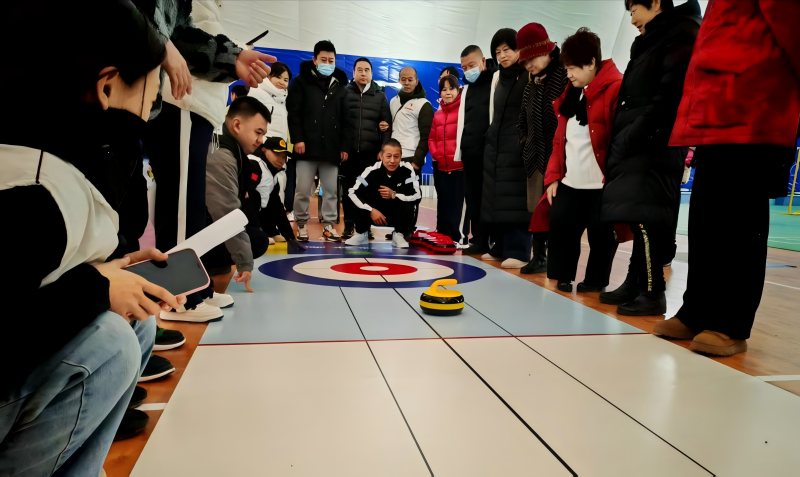 圖為志愿者協(xié)助殘疾人體驗旱地冰壺